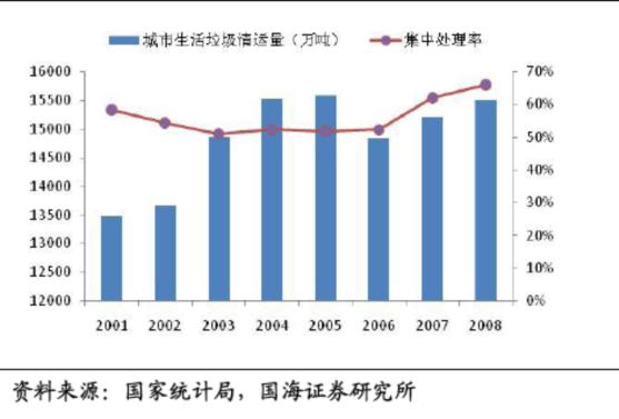 固體廢物可以分為工業(yè)固廢、生活垃圾及危險廢物,而后者的數(shù)量比重很小。2001年至2009年間,工業(yè)固廢的產(chǎn)生量從約9億噸激增到約21億噸,年均復(fù)合增長率達(dá)到12%。由于生活垃圾的產(chǎn)生量比較難統(tǒng)計(jì),在統(tǒng)計(jì)局給出的數(shù)據(jù)中一般用垃圾清運(yùn)量指標(biāo)來代替。生活垃圾的實(shí)際產(chǎn)生量約為清運(yùn)量的兩倍,且清運(yùn)比逐年上升趨勢。2001-2008年,城市垃圾產(chǎn)量復(fù)合增長率為5%,而垃圾清運(yùn)量的增速僅為2.03%,整體來看,垃圾清運(yùn)的速度不及垃圾產(chǎn)生的速度,垃圾圍城現(xiàn)象出現(xiàn),垃圾處理問題開始引起民眾和政府的高度重視。截止2007年,我國未經(jīng)處理的城市生活垃圾累計(jì)堆存量已達(dá)70多億噸,侵占土地面積超過5億多平方米,全國660個城市中有約200個城市陷入垃圾包圍之中。深圳市創(chuàng)新投資集團(tuán)有限公司發(fā)展